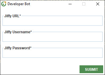 The Jiffy Bot Manager is used to manage the developer bot in a machine. It can be found on the task bar: